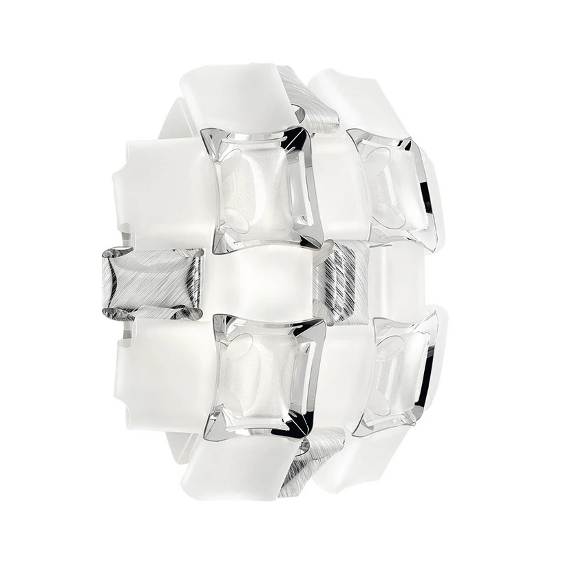 Mida Applique Væglampe White-Platinum er håndlavede væglamper, der er udført i trykt lentiflex og opalflex. De er sammensat ved hjælp af SLAMPs eksklusive magnetsystem, så lampens "sten" overlapper den næsten usynlige ramme.