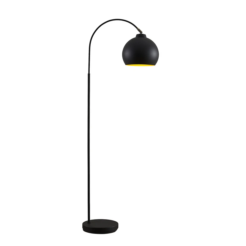 Minali Gulvlampe Black/Gold er et elegant alternativ til den konventionelle gulvlampe. Lampens stel har en iøjefaldende bueform, der på yndefuld vis dypper den voluminøse skærm ned imod det ønskede område, så man kan nyde godt af hele lyskeglen og ikke kun dele af den. Lampen har et sort/gyldent farveskema, der længe har været populært blandt gulv- og pendellamper. Dette skyldes ikke alene, at mat sort og skinnende guld skaber en smuk farvekontrast men også, at den gyldne inderside giver lyset en særligt varm, dyb og hyggelig glød, når lampen er tændt, og lyset reflekteres. Endvidere gør den matte, sorte yderside lampen nem at indpasse på tværs af forskellige indretningsstile.