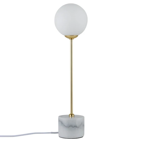 Moa Bordlampe White/Gold/Marble overbeviser ikke alene med sin behagelige og blændfri allroundbelysning men også med sit overordentligt elegante og dekorative lampedesign. Den skønne forening af forskellige former, farver, materialer og teksturer gør Moa Bordlampe til et sandt must have i klassiske eller vintageinspirerede hjem og indretninger. Lampen er sammensat af en rund fod i ægte marmor, som er en smule højere end forventet og giver indtrykket af, at lampen hviler på et podium. Det slanke, gyldne, skinnende stel danner en smuk kontrast til den voluminøse, matterede glasskærm, så der skabes en fin balance mellem enkeltelementerne i det overordnede design.