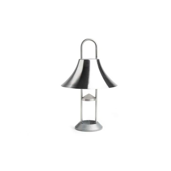 Mousqueton Portable Bordlampe Brushed Stainless Steel tenderer imod at være et lille kunstværk i sig selv takket være sin designorienterede form og slående farve. Lampen er også en praktisk sag, da det trådløse design giver mulighed for at bære den med sig. Grundet sin høje kapslingsklasse egner lampen sig også til udendørsbrug og inviterer derfor til hyggestunder i haven eller på terrassen. Stellet er designet, så det danner en bue øverst. Dette giver mulighed for at hænge lampen på eks. træer som en smuk lanterne på mørke aftener.