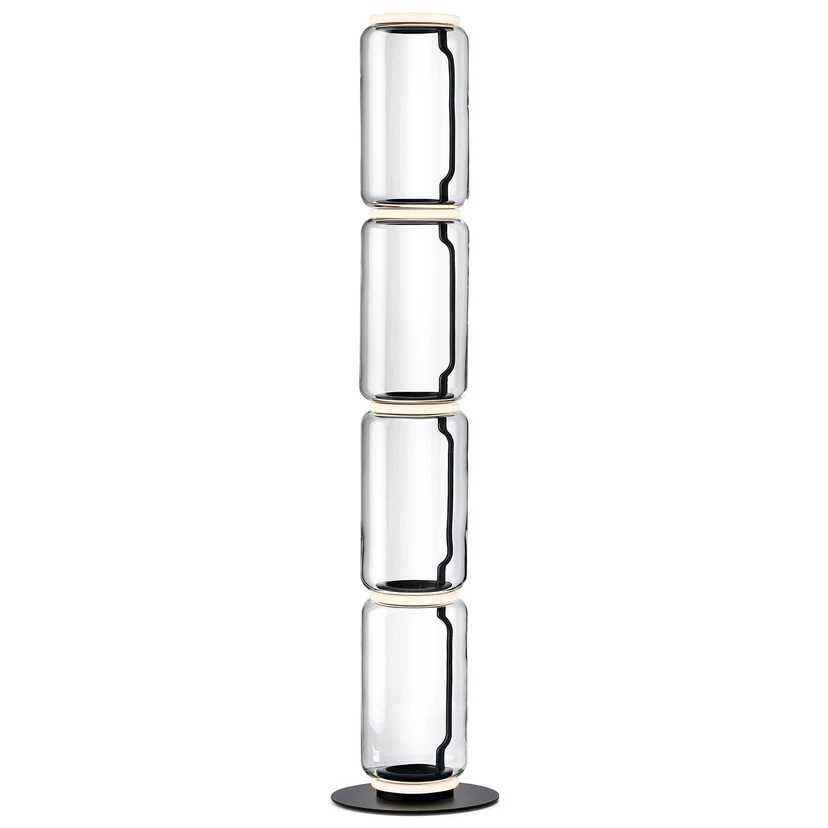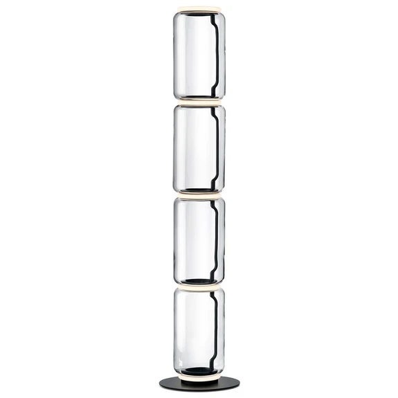 Noctambule F4 Gulvlampe Low Cylinder fra Flos er en elegant standerlampe, der kombinerer moderne design med funktionalitet. Denne gulvlampe består af sammenkoblede glasmoduler, der strækker sig op til en imponerende højde på 2,17 meter. Den cylindriske og halvkugleformede struktur er lavet af mundblæst krystal, hvilket giver lampen et klart og sofistikeret udtryk. Basen og ringene er fremstillet af trykstøbt aluminium, mens de indre laterale arme er lavet af hydroformet stål. Yderligere er der optiske opal silikone ringdiffusorer, der sikrer en jævn fordeling af lyset.