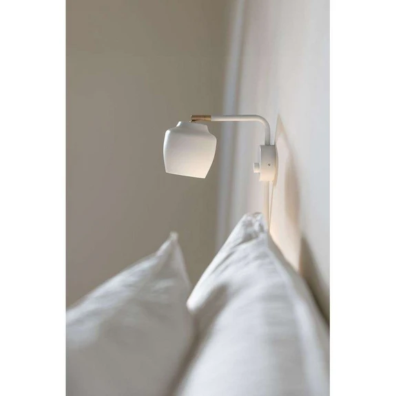 Nola Væglampe Hvid fra CPH Lighting er en elegant og funktionel væglampe, der kombinerer et organisk formsprog med robusthed. Denne væglampe er en del af Nola serien, designet af Morten Flensted, som også inkluderer en bordlampe og en pendel. Lampehovedet, fremstillet af aluminium ved hjælp af klassiske metaloptryk teknikker, hviler på et slankt stag og giver et let og elegant udtryk. Stag og fodplade er lavet af stål, og hele lampen er pulverlakeret i hvid med detaljer i rå messing, der patinerer smukt over tid.