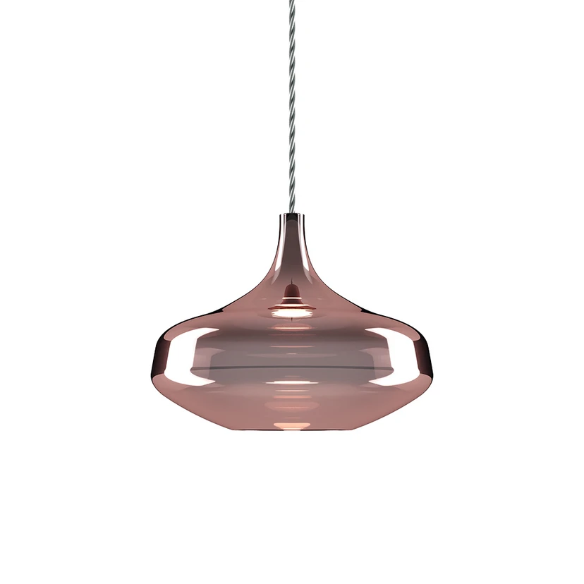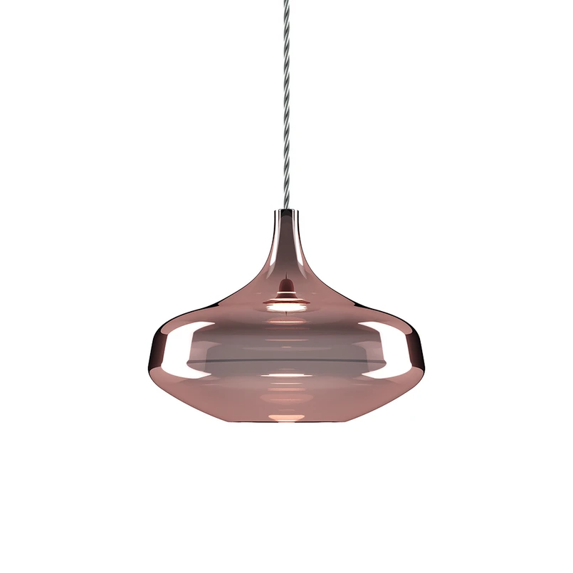 Nostalgia Pendel SO3 Rose Gold lader fortid og fremtid smelte sammen i en herlig forening. Lampen er kendetegnet ved sin plastiske form og flydende udtryk, der gør den til en utroligt let designet belysningsmodel. Skærmen er fremstillet af mundblæst glas, hvorved hvert eksemplar bliver et unikum, da der kan forekomme individuelle afvigelser. Glasset er blæst og formgivet, så det danner bløde, runde, organiske former, der giver den dét helt særlige nostalgiske præg, som serien har navn efter.