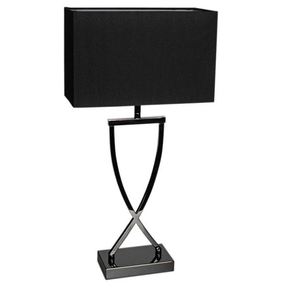 Omega Bordlampe Black/Chrome sætter et elegant twist på det minimalistiske stilkoncept og beriger indretningen med lækkerhed i både lys og design. Lampen har et enkelt designsprog med en kasseformet lampeskærm, der bringer mere stilrenhed ind i designet end den konventionelle cylinderskærm, et neutralt farveskema og en smuk simplicitet i den måde, hvorpå tekstil og metal forenes. Det eneste sted, hvor lampens design ikke er retvinklet, er dens smukke, tvedelte stel, der krydser over på midten og danner en nydelig sløjfe. Øjet drages naturligt imod denne fine tilføjelse, hvorfor Omega Bordlampe ikke kun fungerer som praktisk accentbelysning men samtidig udgør et smukt dekorationselement. Af denne grund kan lampen med fordel placeres et sted med stor synlighed, hvor det flotte design kan komme til sin ret.