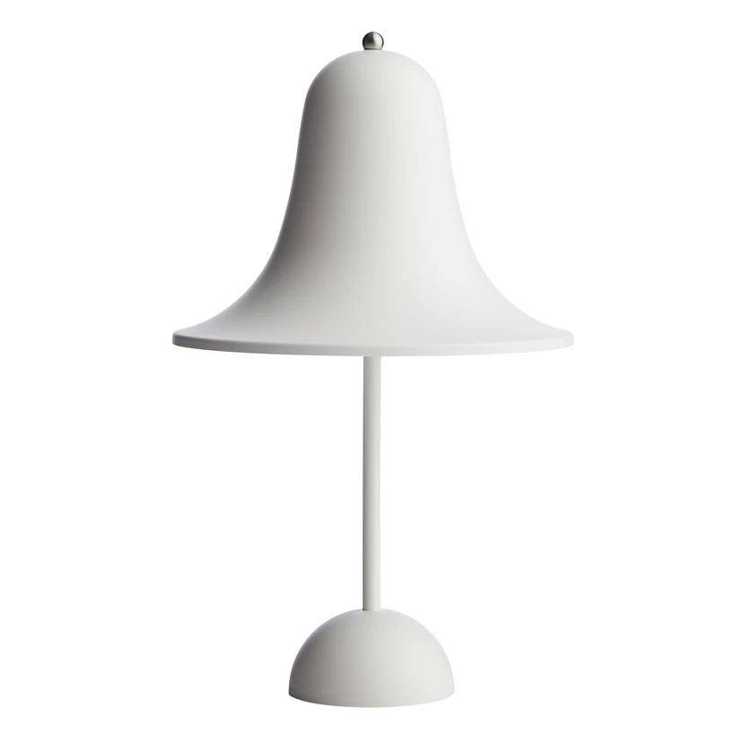 Pantop Portable Bordlampe Matt White præsenterer ikoniske Verner Panton på toppen af sin kreative formåen. Den klokkeformede silhuet har en legende elegance over sig. Designet er i sin essens moderne funktionalisme i den forstand, at lampen først og fremmest er formet med henblik på at være praktisk. Derfor sidder lyskilden gemt øverst i den klokkeformede skærm, hvorfra de varme og indbydende stråler glider direkte nedad. Derved rammer lyset altid øjet indirekte uden at skære eller blænde, men afgiver i stedet et lækkert indirekte lys til både arbejde og afslapning.