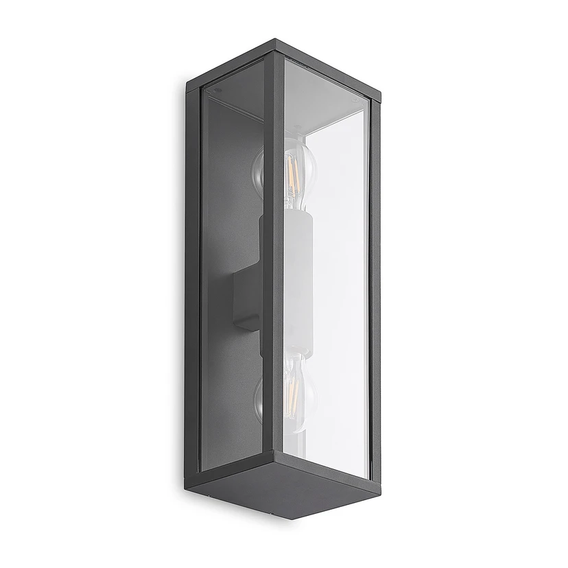 Peldar 2 Udendørs Væglampe Dark Grey er en alsidig og moderne lampe, der forbedrer udendørsoplevelsen med sin praktiske og klare belysning. Lampen har et grafitgråt aluminiumsstel, der danner en ramme omkring lyskilden i toppen. Pæren er afskærmet af gennemsigtige glasindsatser, der er fuldkommen transparente og derfor muliggør, at lyset kan slippe frit og uhæmmet ud til alle sider i et klart og direkte skær. Dette betyder samtidig, at lyskilden er synlig og derfor udgør en visuel del af lampens overordnede udtryk, hvorfor man bør vælge sin pære med omhu. Her er det en stor fordel, at lampens E27-fatning passer til en lang række pæretyper. Her kan man både bruge dekorative filamentpærer og energibesparende LED-modeller.