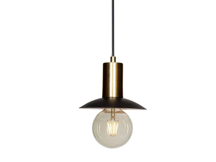 Quinn Pendel Matt Black er en skøn og innovativ lampemodel med et opfindsomt udtryk. En stor del af lampens udseende optages af dens skinnende, messinggyldne stel, der skaber et smukt komplement til den matte, sorte lampeskærm. Nedenunder hænger lyskilden frit, så den kan skinne ud til alle sider i et direkte skær, hvor intet af lysudbyttet går tabt. Da lyskilden indgår som en central del af lampens visuelle udtryk, kan man med fordel udstyre lampen med en dekorativ pæremodel, eks. en globepære eller en pære med tonet glas for en mere blød og diffus lysgengivelse.