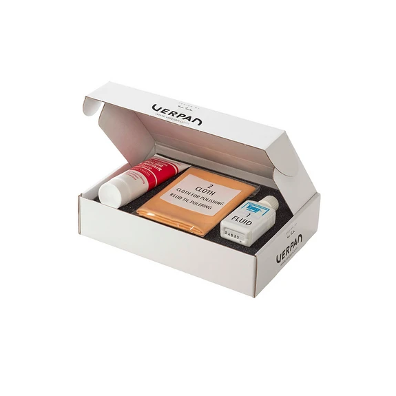 Rengøringssæt til består af en væske, en pasta og to klude, der er helt ideelle til rengøring og fjernelse af små ridser på lampens akrylskaller.