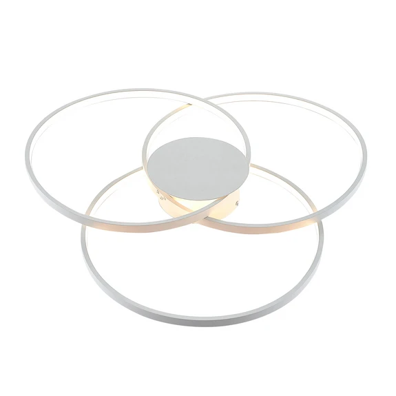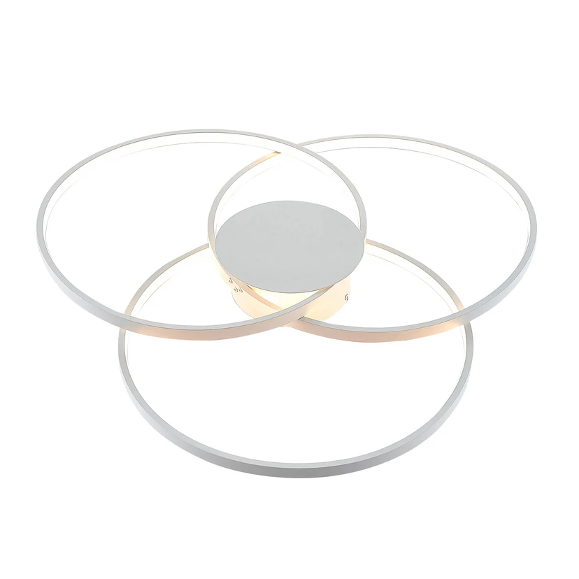 Riley LED Loftlampe DIM White tegner med sine tre overlappende ringe et smukt symmetrisk mønster på loftet, der fanger og forfører øjet, selv uden lyset tændt. Stilen er udpræget moderen, hvilket understøttes af den simple monokrome farve. Den puristiske udstråling er oplagt til i forvejen moderne indrettede hjem.