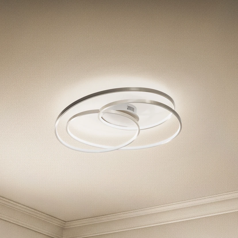 Ronka LED Loftlampe Satin Nickel snor sig i et abstrakt næsten organisk levende spiral mønster henover loftet. Fra ringens inderside udgår det klare og dejlige LED lys, der på grund af den smarte placering ikke rammer øjet direkte og blænder. I stedet dirigeres det indad mod loftet, hvorfra det spreder sig blidt og diffust.