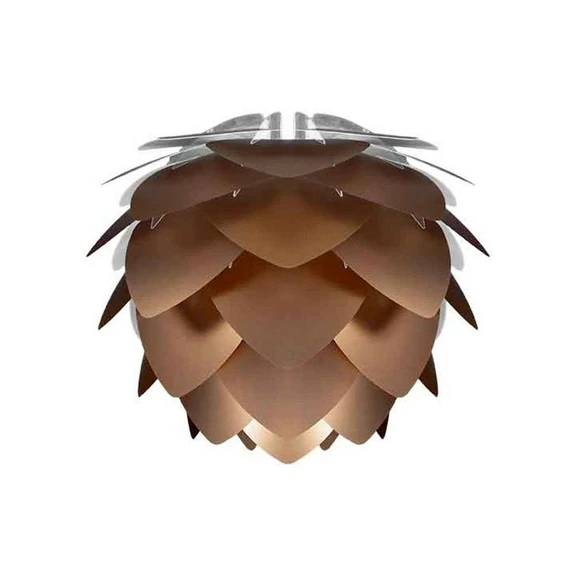 Silvia Mini Skærm Bronze fra Umage er med sine karakteristiske bladformede lag en moderne klassiker, der passer inden for i et hvert hjem. Den er superelegant over et bord, i entréen, i soveværelset … ja, hvor som helst … el-pæren er nemlig ikke synlig og du kan dermed hænge din lampe i netop den højde, der passer til dit rum.