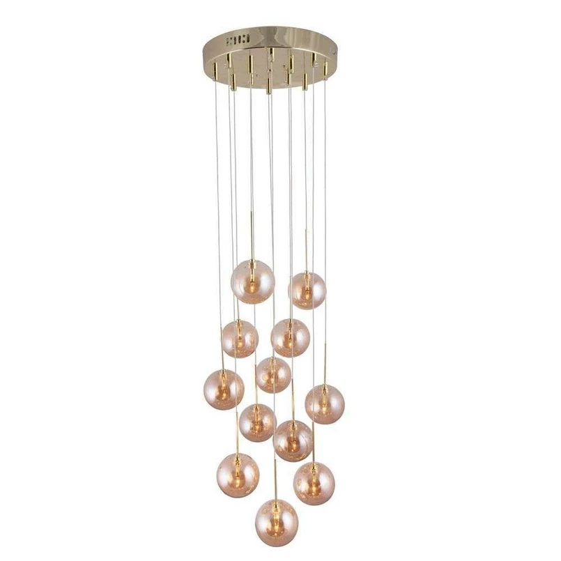 Skyfall Pendel Amber er et ekstravagant og overdådigt design, der vil tilføje en ubesværet og øjeblikkelig elegance til din boligindretning. Skyfall er en pendel med en række svævende små glaskugler, der hænger i fine, tynde kabler som små regndråber fra himlen. Lampen fuldendes af den enestående baldakin i messingfarvet metal, der er monteret på loftet samt de 12 kabler, som hænger derfra med tilhørende ravfarvede glaskugler, som spreder en atmosfærisk glød, der formår at sætte en varm og hyggelig stemning.