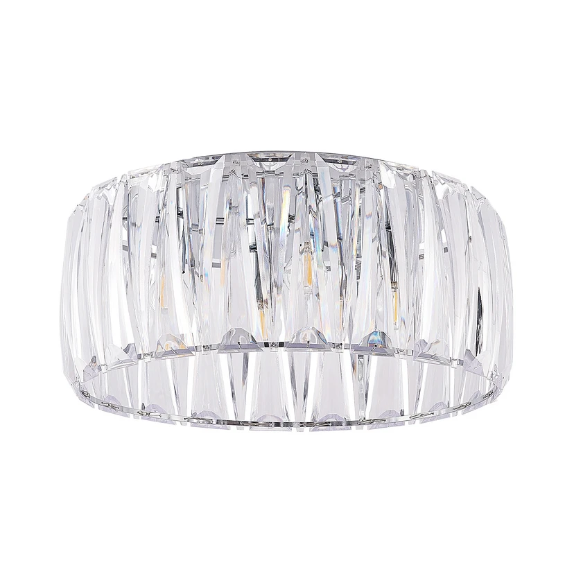 Sofia Loftlampe Transparent/Chrome er et overdådigt pragtstykke af et lampedesign, der erstatter den traditionelle lysekrone. Skærmen har en ejendommelig struktur i rillet glas, der glinser krystalagtigt i slukket tilstand. Men når lampen tændes, kaster skærmen et fantastisk lysspil ud på loftet og overalt omkring sig, så der opstår et fascinerende samspil mellem lys og skygge. Denne imponerende effekt tager sig fantastisk ud i store, åbne rum, og får dem til at virke endnu større.