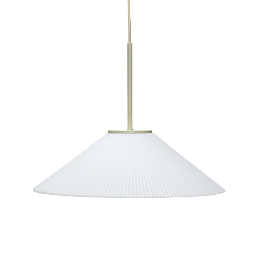 Solid Pendel Sand/White præsenterer sig i et stilfuldt, tilgængeligt design og er en nem lampe til at forskønne indretningen. Lampen har et neutralt farveskema med en hvid, monokrom skærm og en ledning i beige, der skaber et diskret farvespil. Skærmen har en klassisk kegleform, der åbner sig bredt nedad, så lyset kan strømme ud i et spredt skær og fordele sig over et stort område. Af denne grund kan man med fordel montere Solid Pendel over spiseborde og andre overflader med behov for direkte belysning. Skærmen har en riflet udformning, der minder en smule om den klassiske plisserede tekstilskærm. Imidlertid er skærmen fremstillet af glas, hvilket bevirker, at den selv lyser på i et smukt og atmosfærisk skær, når lampen er tændt. Dermed har man en smuk kombination af direkte og indirekte belysning, der samtidig fremhæver det stilfulde design.
