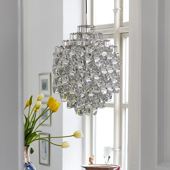 Spiral SP01 Sølv er et ikonisk design af danske Verner Panton, som smukt viser hans bud på orden i kaos. Spiral serien består af en række pendler med det samme karakteristiske design med klaser af spiraler, der skaber liv og dynamik, som gør den yderst iøjnefaldende, og sammenspillet mellem de enkelte spiraler gør, at de smukt oplyser ethvert rum med sin funktionalitet og æstetik. Du kan placere lampen forskellige steder i hjemmet, hvor over spisebordet, i entréen eller i stuen blot er nogle af de oplagte steder. Her skaber de mange spiraler en behagelig og diffus spredning af lyset ud til hele rummet, som sætter en hyggelig og indbydende stemning. Kollektionen er et nydeligt eksempel på Pantons eksperimentelle tilgang til farver og former, hvor Spiralen demonstrerer, hvordan et objekt kan interagere med sit miljø gennem refleksion, lyd og bevægelse. Du kan få Spiralen i forskellige versioner og farver, så du kan få præcis dén variant, der passer bedst i dit behov og din stil. Med en Spiral lampe er du garanteret et ikonisk kunstværk, som både fungerer som belysningskilde og dekorativt element i din indretning