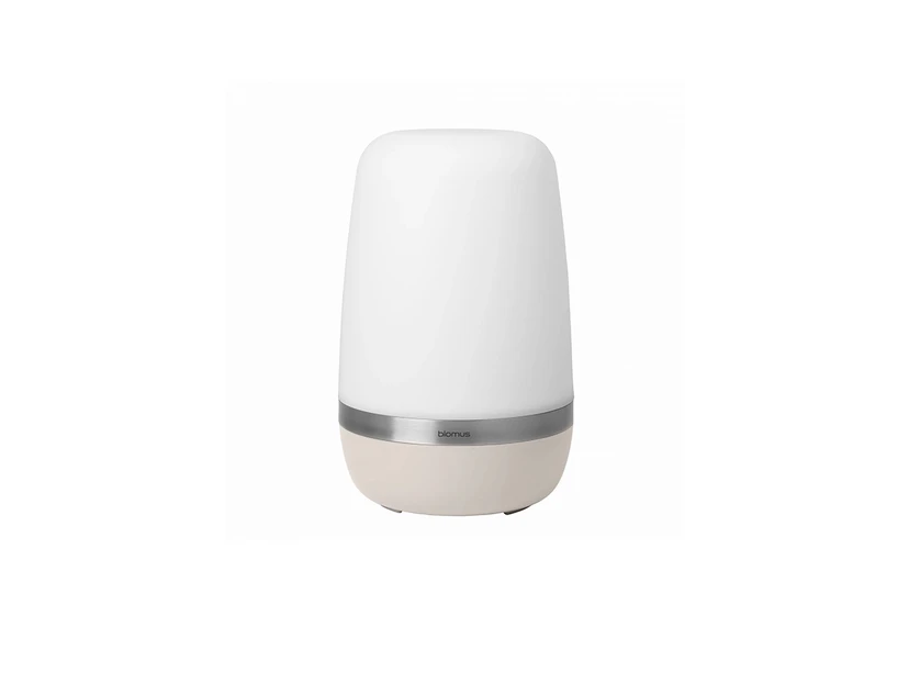 Det indbyggede LED skinner let gennem skærmen af plast. Den fås med en bund i enten platingrå, varmgrå eller moonbeam, som er suppleret med en rustfri metalring. Vælg mellem den lille lampe med en højde på 15 centimeter og en diameter på 9, eller den store med en højde på 25 og en diameter på 15 centimeter.