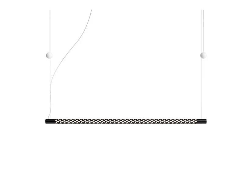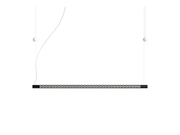 Squiggle H8 Pendel 3000K Matt Black er en unik og stilfuld pendel fra Rotaliana, der vil tilføje et moderne touch til dit hjem. Inspireret af Lucio Fontanas Neon structure fra den 9. Triennale i Milano, er denne pendel et kunstværk i sig selv. Den består af et ophængt, tubulært metalskelet, der skjuler en LED-strip på op til 6 meter. De uregelmæssige, sekskantede huller i metallet skaber en fascinerende lyseffekt, der danner forskellige geometriske former som brudte kurver, uendelighedssymbolet og koncentriske ringe i forskellige størrelser. Med sin elegante sorte farve og slanke dimensioner på H: 4 cm og L: 140 cm, passer denne pendel perfekt ind i både moderne og klassiske indretninger. Den er ideel til at skabe en stemningsfuld belysning over spisebordet, i stuen eller i entréen. Gør dit hjem unikt med denne bemærkelsesværdige lampe.