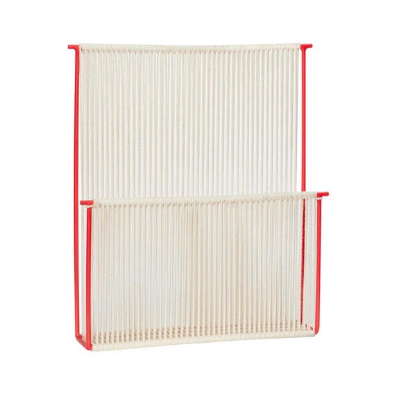 String Wall Magazine Holder Red/White er en praktisk tilføjelse til både venteværelset, badeværelset og kontoret. Med sit smukke design i vævet bomuldstekstil og cremehvide nuance præsenterer String Magazine Holder et praktisk stykke interiør med et visuelt tiltalende udseende, der forskønner den overordnede indretning med et særligt designorienteret præg. Tekstilet er tyndt men holdbart og kan holde mange blade på én gang. Samtidig er stoffet semi-transparent, så man kan ane forsiden af det forreste blad – et praktisk touch til det stilfulde design. Som en fin ekstra tilføjelse er metalstellet lakeret med en slående rød nuance, der fanger øjet og smukt indrammer designet.