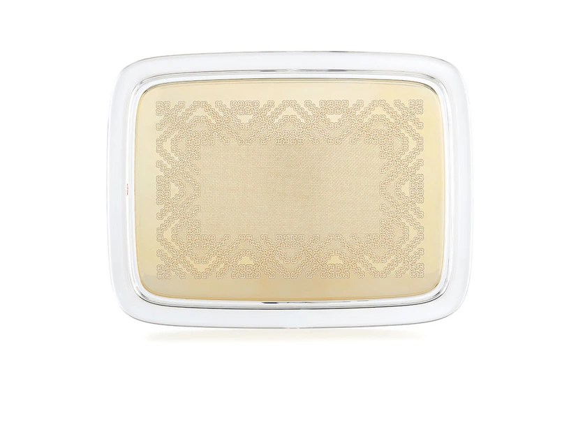 Teatime Tray 44x33 Gold er en skøn forening af moderne ideer og traditionel designstil. Særligt definerende for dette design er det regelmæssige broderimønster i bunden. Det detaljerige væld af filigran danner en sindrig sammensætning af snirkler og krummelurer, der smukt forener sig med den flotte farvenuance. Kanterne er gennemsigtige og giver således bakken et rent look. Bunden har et metallisk skær, hvilket giver en subtil spejleffekt og får bakkens indhold til at tage sig smukt ud. Bakken kan bruges til både praktiske og æstetiske formål.