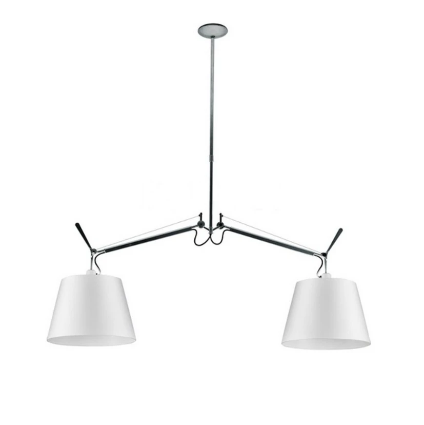Takket være de justerbare arme kan du diregere lyset fra lampen hvorhen, du ønsker. Vælg mellem to forskellige lampeskærme; den grå Satin-version, der nærmest har aluminiumsfarve, når lampen er slukket, men synes hvid i det øjeblik, lampen er tændt. Versionen i pergamentpapir har derimod en beige farve, der bliver silkeagtig, når den oplyses.