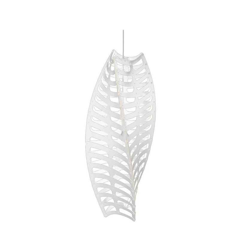 Toru Pendel Small 2 Sider Hvid fra David Trubridge er en elegant pendellampe, der kombinerer moderne design med den naturlige skønhed fra den prisvindende Navicula lampe. Denne unikke lampe, inspireret af mikroskopiske diatomer, har en fascinerende tre-sidet form, der tilføjer en skulpturel dimension til dit hjem. Fremstillet af bambus krydsfiner, nylonklemmer og pulverlakeret aluminium, er Toru pendlen både holdbar og smuk. Den kan installeres både horisontalt og vertikalt, hvilket giver dig fleksibilitet til at tilpasse den til din indretning. De tre sider skaber en betagende leg med lys og skygge, der giver en varm og indbydende atmosfære, perfekt til spisebordet, stuen, entréen eller som et iøjnefaldende hjørneelement. Toru lampen passer ind i ethvert rum, fra stuen til soveværelset, og kan nemt monteres med en standard E26/E27 pære. Dens moderne design og udsøgte håndværk gør den til et fremtrædende element, der komplementerer enhver indretning. Oplev den naturlige skønhed af diatomer i dit hjem med Toru pendellampen.