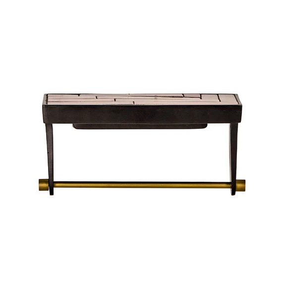 Under hylden finder du en antik messing-behandlet stang, der fungerer som et praktisk stativ til håndklæder eller karklude. Denne hylde er ikke kun en praktisk opbevaringsløsning, men også en stilfuld måde at fremvise dine yndlings fyrfadsstager eller små vaser på, hvilket skaber en indbydende atmosfære. Med dens alsidige anvendelse og kvalitetsmaterialer er denne hylde et must-have for enhver, der ønsker at tilføje karakter og stil til deres hjem.