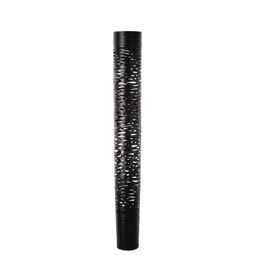 Tress LED Grande Gulvlampe Sort er en detaljeorienteret lampe med et interessant design, der fanger beskuerens blik fra første færd. Lampen har en forholdsvis enkel og geometrisk ren udformning. Overfladen er imidlertid perforeret af et sindrigt hulmønster, der får skærmens materiale til at minde om en flettet struktur. Skærmen er fremstillet af kompositmateriale på en lakeret glasfiberbase – et sindrigt spind af tråde og harpiks, der fungerer som udsmykning, struktur og diffuser på samme tid. Kombinationen af åben og lukket struktur skaber et smukt lysspil, hvor lyset kan trænge ud gennem hullerne men samtidig er afdækket af skærmen, så lyset fremstår diffust og blændfrit. Hulstrukturen skaber et fascinerende samspil mellem lys og skygge, der projiceres ud til alle sider af lampen og skaber en yderst dekorativ belysning.