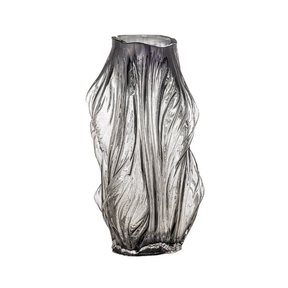 Tulla Vase Grey - Bloomingville er en smuk tilføjelse til dit boligtilbehør. Denne vase fra Bloomingville er fremstillet af glas og har en elegant, bølget form, der tilføjer et strejf af raffinement til ethvert rum. Den grå og klare farve kombineret med det rustikke mønster skaber en unik tekstur, der fanger lyset på en betagende måde. Vasen er 32 cm høj og har en diameter på 17,5 cm, hvilket gør den ideel til både store og små blomsterarrangementer.