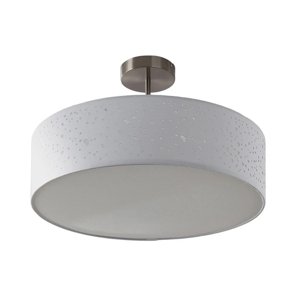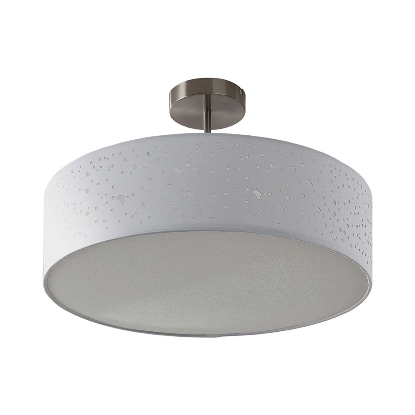 Umma oftlampe H30 White/Satin Nickel er karakteriseret ved en enkel form og alsidig farve kombineret med et festligt og anderledes design. Hele ydersiden er perforeret af talrige små huller, der er lavet med laserskæringsteknik. Hullerne forfiner ikke bare lampens udseende men giver også en enestående lyseffekt: når lampen er tændt, skinner lyset ud gennem hullerne som små stjerner på himlen, i et tindrende skær, der smukt supplerer det overordnede lysbillede. Dog er det ikke kun pletterne, der skinner, men hele lampen: skærmen er betrukket med stof i en nydelig og tilgængelig farvenuance, der effektivt gennemtrænges af lyset fra pæren bagved. Den samlede lyseffekt er derfor en blød, blændfri belysning med hyggelige accenter takket være det unikke huldesign.