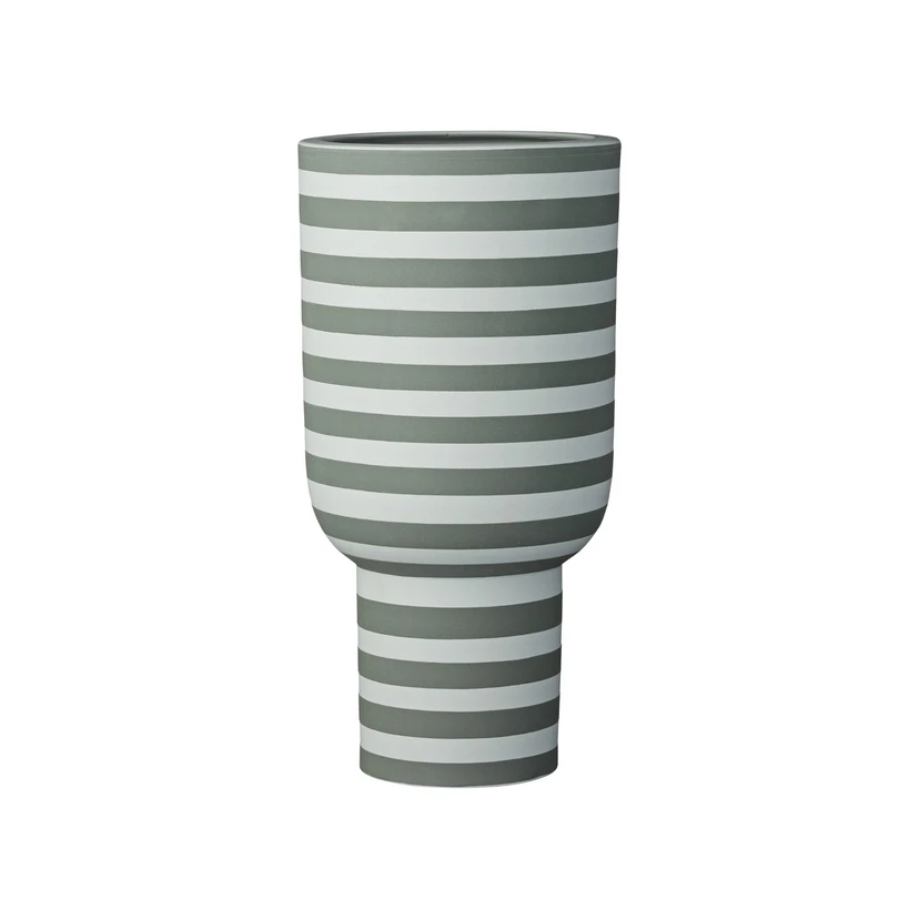 Varia Sculptural Vase Dusty Green/Forest fra AYTM er en unik og iøjnefaldende tilføjelse til dit hjem. Denne vase, lavet af solid sten, kombinerer twisted linjer, forskellige former og livlige farver, hvilket gør den til et kunstværk i sig selv. Den smukke Dusty Green/Forest farvekombination, sammen med det stribede mønster, skaber en visuel oplevelse, der vil fange opmærksomheden i ethvert rum. Udover at fungere som en vase, kan Varia også bruges som en blomsterpotte, hvilket giver dig fleksibilitet i din indretning. Dens unikke design gør den perfekt til at stå alene som et statement-stykke, men den kan også kombineres med andre glasvaser for et mere dynamisk udtryk. Uanset hvordan du vælger at bruge den, vil denne vase fra AYTM tilføje et strejf af elegance og originalitet til dit hjem.