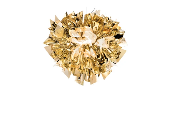 Veli Pendel L Guld er en florlet og kunstfærdigt designet lampe der fanger blikket fra første øjekast. Lampens fascinerende formsprog afspejler tydeligt den artistiske stil, der går igen i alle kreationer af den italienske designer Adriano Rachele: En kunstlet ynde skabt af transparente elementer, bløde kanter og smukke farveschatteringer. Lyskilden sidder midt inde bag den detaljerige skærm og skaber et flot farvespil, når man tænder for lampen og konturerne af de mange bølgende, flydende former træder tydeligt frem.