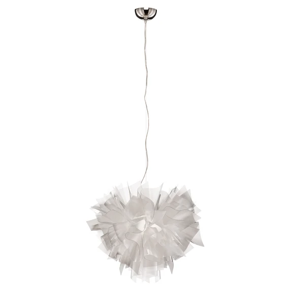 Veli Pendel L Prism er en florlet og kunstfærdigt designet lampe der fanger blikket fra første øjekast. Lampens fascinerende formsprog afspejler tydeligt den artistiske stil, der går igen i alle kreationer af den italienske designer Adriano Rachele: En kunstlet ynde skabt af transparente elementer, bløde kanter og smukke farveschatteringer. Lyskilden sidder midt inde bag den detaljerige skærm og skaber et flot farvespil, når man tænder for lampen og konturerne af de mange bølgende, flydende former træder tydeligt frem.
