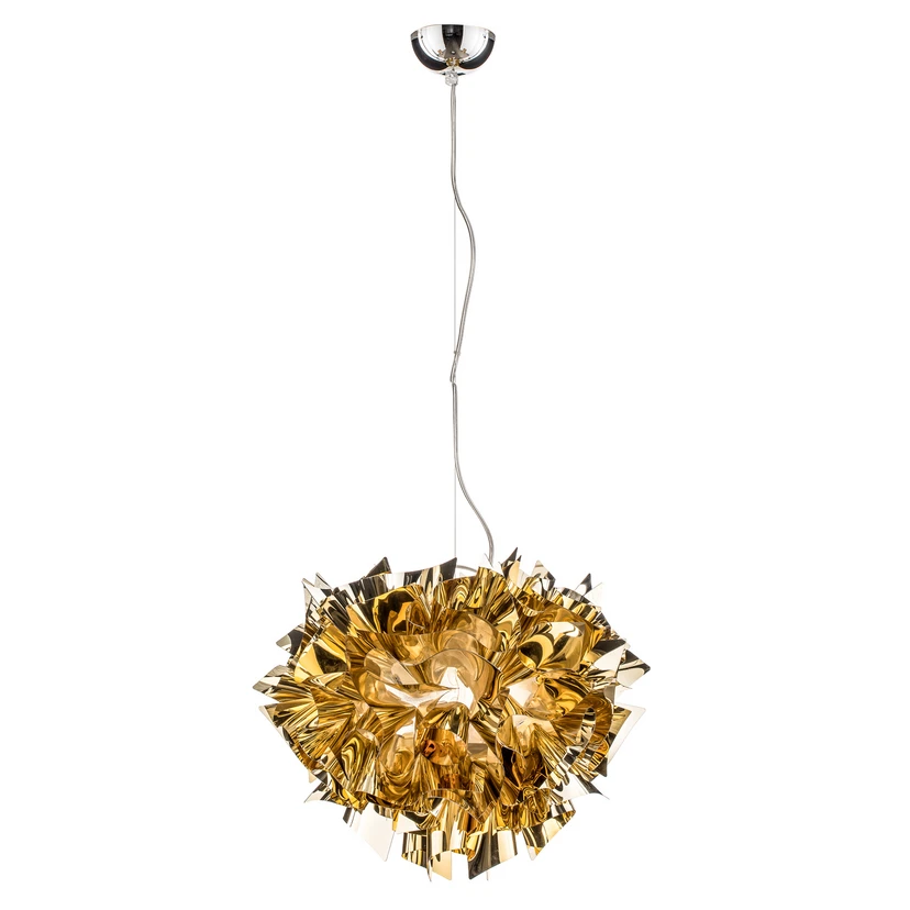 Veli Pendel S Guld er en florlet og kunstfærdigt designet lampe der fanger blikket fra første øjekast. Lampens fascinerende formsprog afspejler tydeligt den artistiske stil, der går igen i alle kreationer af den italienske designer Adriano Rachele: En kunstlet ynde skabt af transparente elementer, bløde kanter og smukke farveschatteringer. Lyskilden sidder midt inde bag den detaljerige skærm og skaber et flot farvespil, når man tænder for lampen og konturerne af de mange bølgende, flydende former træder tydeligt frem.