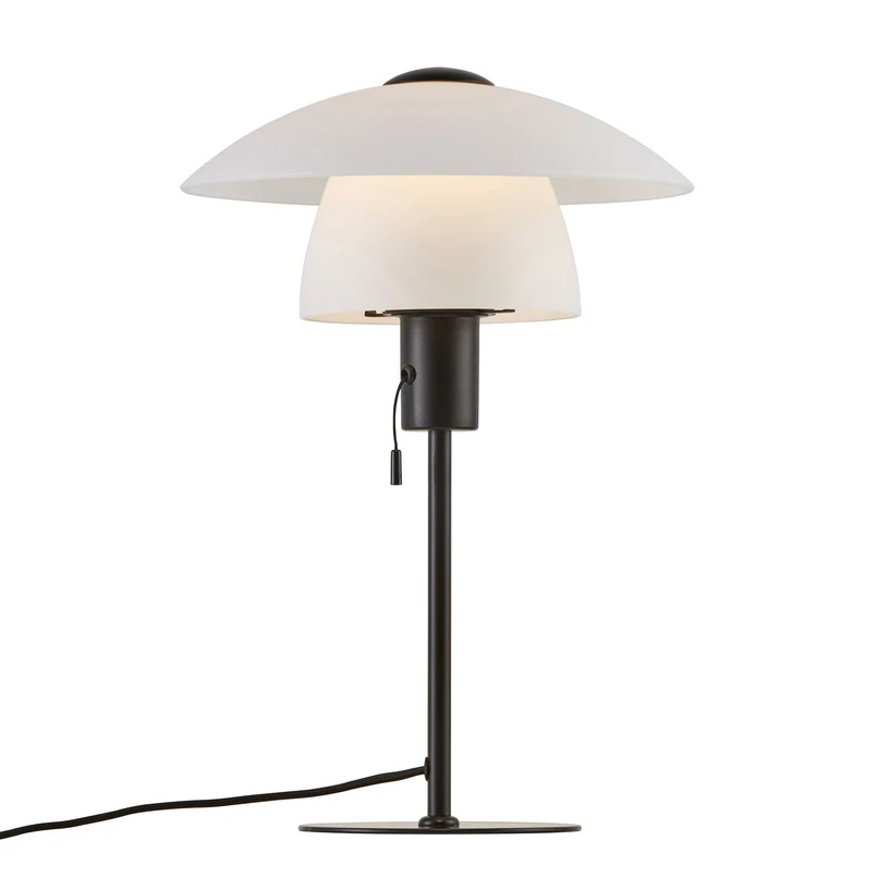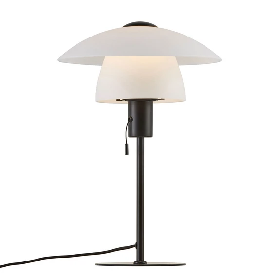 Verona Bordlampe Opal er en vellykket forening af sort og hvidt, af glas og metal, i et smukt, tidløst design, der gennem sine kontrasterende farver og materialer fremstår som en velafbalanceret og gennemtænkt lampemodel, som til hver en tid vil fremstå smagfuld og stilrigtig. Lampeskærmen har et klassisk flerlags-look. Hvert skærmpanel er udført i hvidt opalglas, der lyser op i et smukt, mat skær, når lampen tændes. Samtidig dirigerer skærmene lyset nedad i et flot downlight.