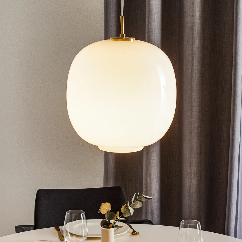 VL45 Radiohus Pendel Ø370 V3 Messing/Glossy Opal Glas er en klassisk lampe designet af Vilhelm Lauritzen i samarbejde med Louis Poulsen. Den blev oprindeligt skabt i slutningen af 1940'erne til DR's Radiohus i København. I 2016 blev lampen relanceret under navnet VL45 Radiohuspendel, og i 2019 blev sortimentet udvidet med en mindre størrelse for at give flere anvendelsesmuligheder.