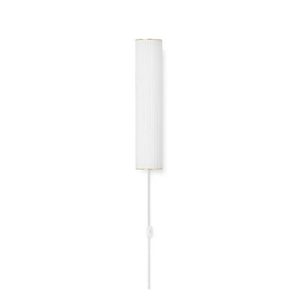 Vuelta Væglampe 40 White/Brass er elegance, blød belysning og stilrent design, samlet i én smuk lampe. Den cylinderformede rør i opalglas, skjuler den lyskilden og tilfører lampens design en moderne enkelthed. Det karakterfulde riller i overfladen fremhæves når lampen tændes, og giver lampen et strejf af art deco stilen.