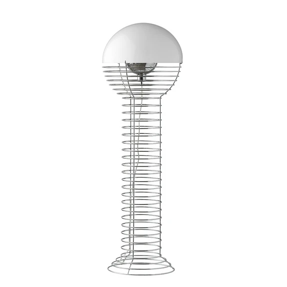 Selve kroppen er sirligt snoet op af forkromet metalwire der slutteligt er kronet med en plastic skærm, som dækker for pæren, så den ikke blænder.