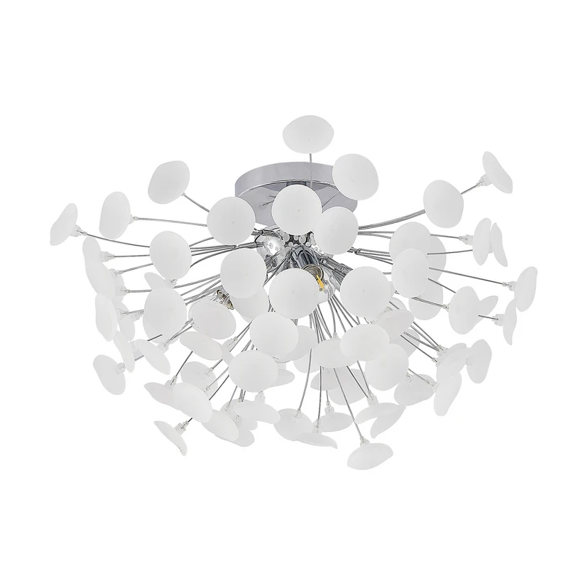 Yurina Loftlampe Chrome er den oplagte lampe til dig, der mangler effektiv grundbelysning i hjemmet men samtidig efterspørger et smukt design, der forfiner rummets æstetik, så indretningen ikke bliver anonym. Loftlampen byder på noget ud over det sædvanlige. Skærmen er sammensat af et utal af slanke metalstænger med et hvidt, rundt element ude i hver ende, der får det overordnede design til at minde om en blomst i fuldt flor eller en mælkebøtte i frø. De flotte blomsterassociationer giver lampen et livligt præg med organiske undertoner, der tager sig særligt pænt ud, hvis man i forvejen er glad for blomster eller planter i indretningen.