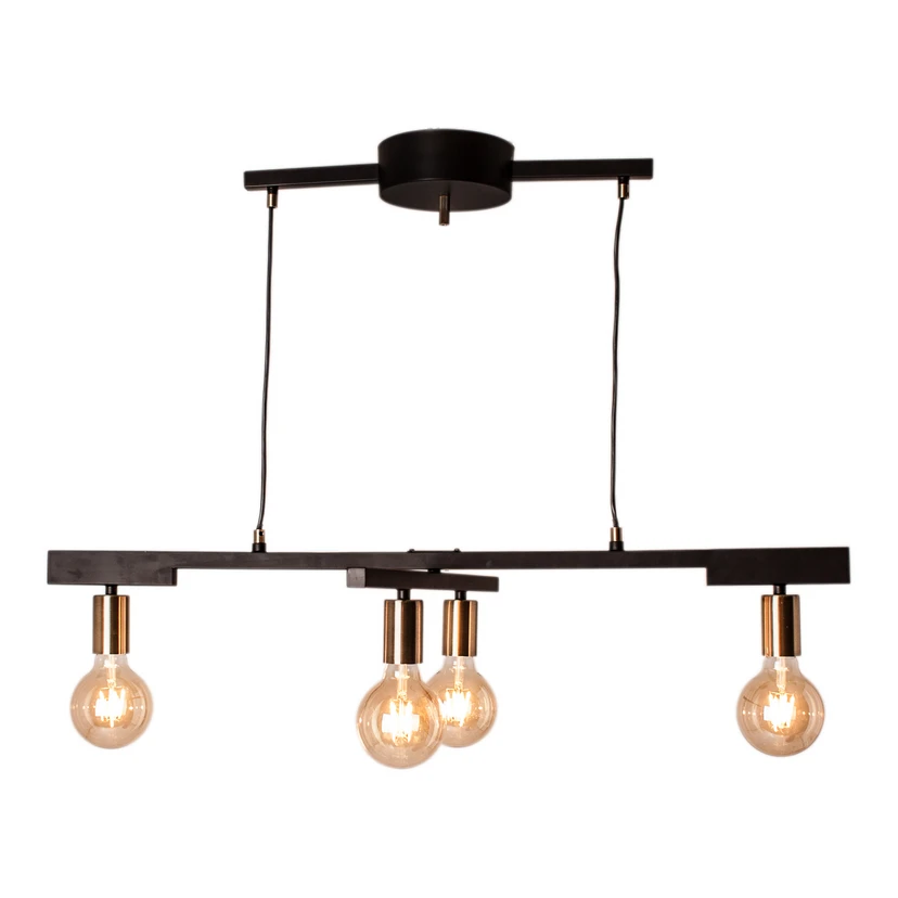Zeona 4 Pendel Matt Black er en enkel og moderne pendel med et alsidigt design, der byder på praktisk belysning. Lampens stel er formet i et kryds, hvor de fire lyskilder er placeret i hver ende, så der opnås en fin lysspredning. Lampedesignet omfatter ikke skærme, hvorfor lyskilderne hænger frit synlige. De kan derfor skinne klart ud i rummet i et direkte skær, der når ud til alle sider. Af denne grund kan man med fordel bestykke lampen med ravtonede pærer for et varmere og blødere lys eller med andre dekorative modeller og dermed give lampen et personligt udtryk gennem valg af lyskilde.